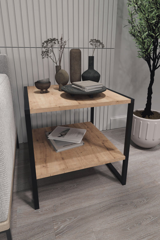 Buyqualia Mesa de Centro Cuadrada de Estilo Industrial con revistero en melamina y Acero Color Roble - Negro (Alto 56 / Ancho 50 / Fondo 50)