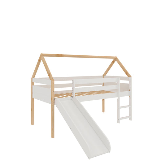 Cama infantil estilo casita con Tobogán y Escalera - 45x195x97 cm (Blanco y Madera) - Buyqualia