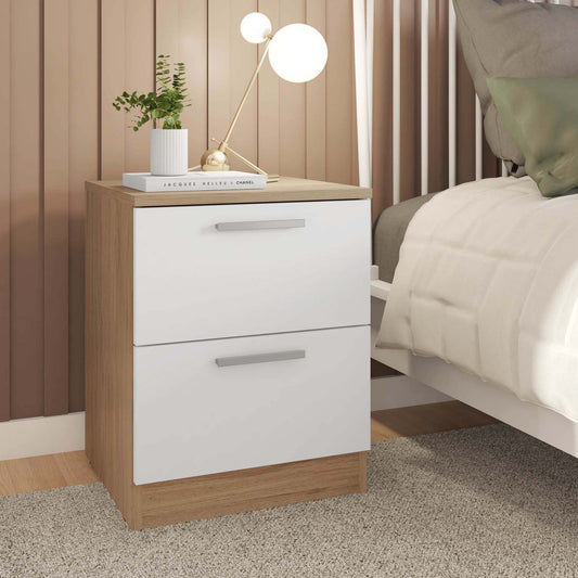 Cabecero tapizado en Color Tierra y Dos mesitas de Dos cajones en Color Blanco - Oak